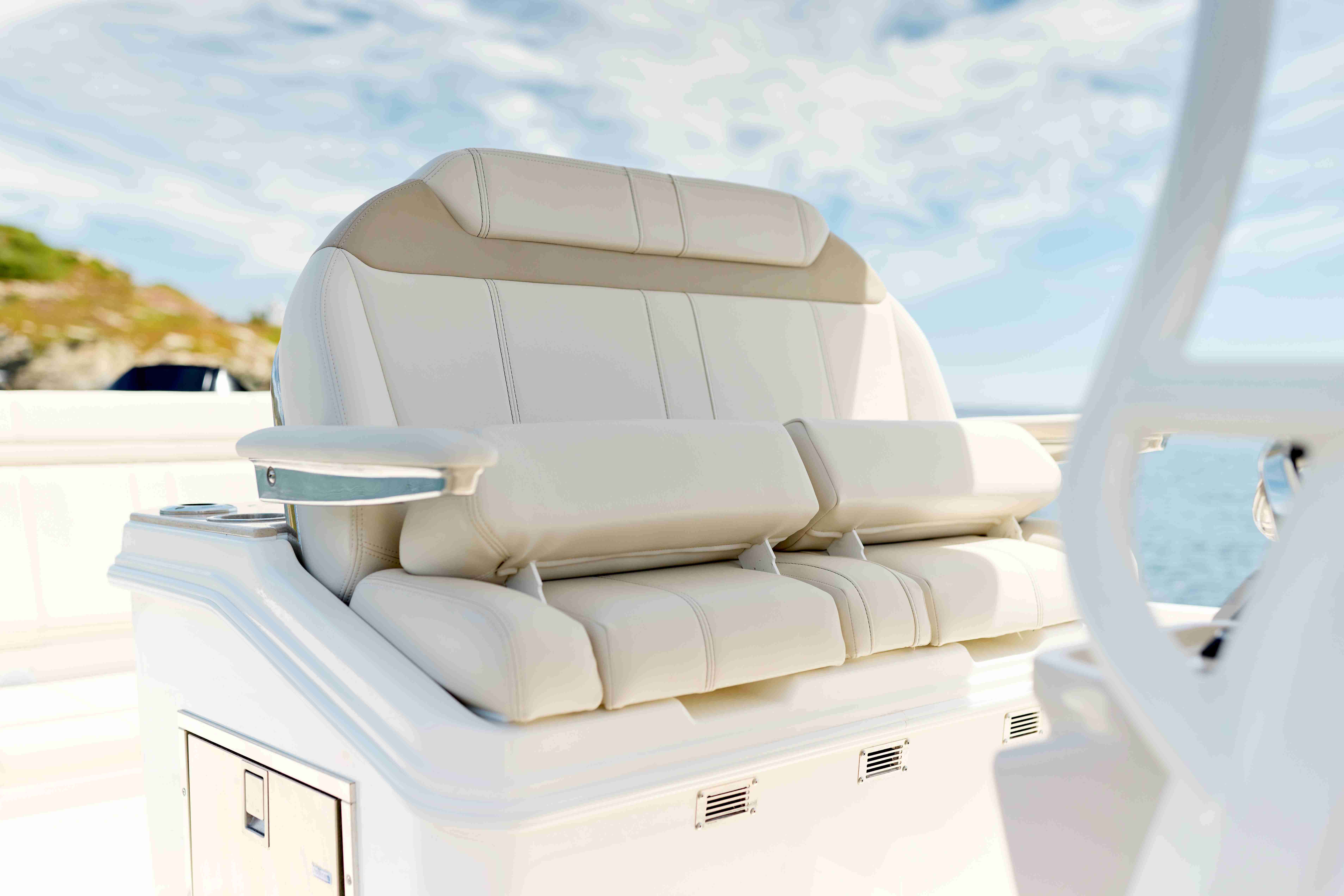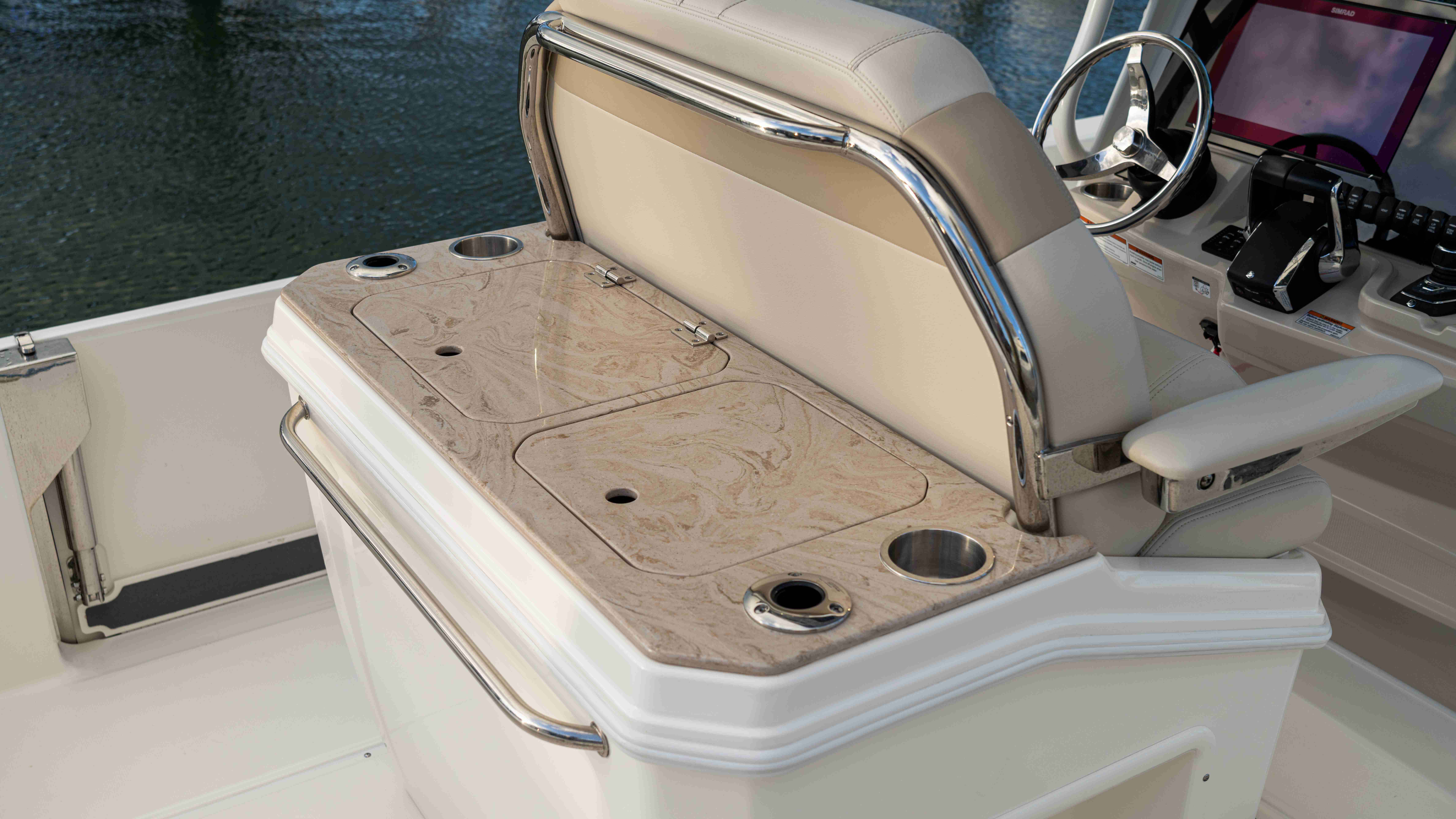 - Innovative helm seat transforms from a captain’s chair into a leaning post or into a stern facing bench seat for a vantage point for trolling