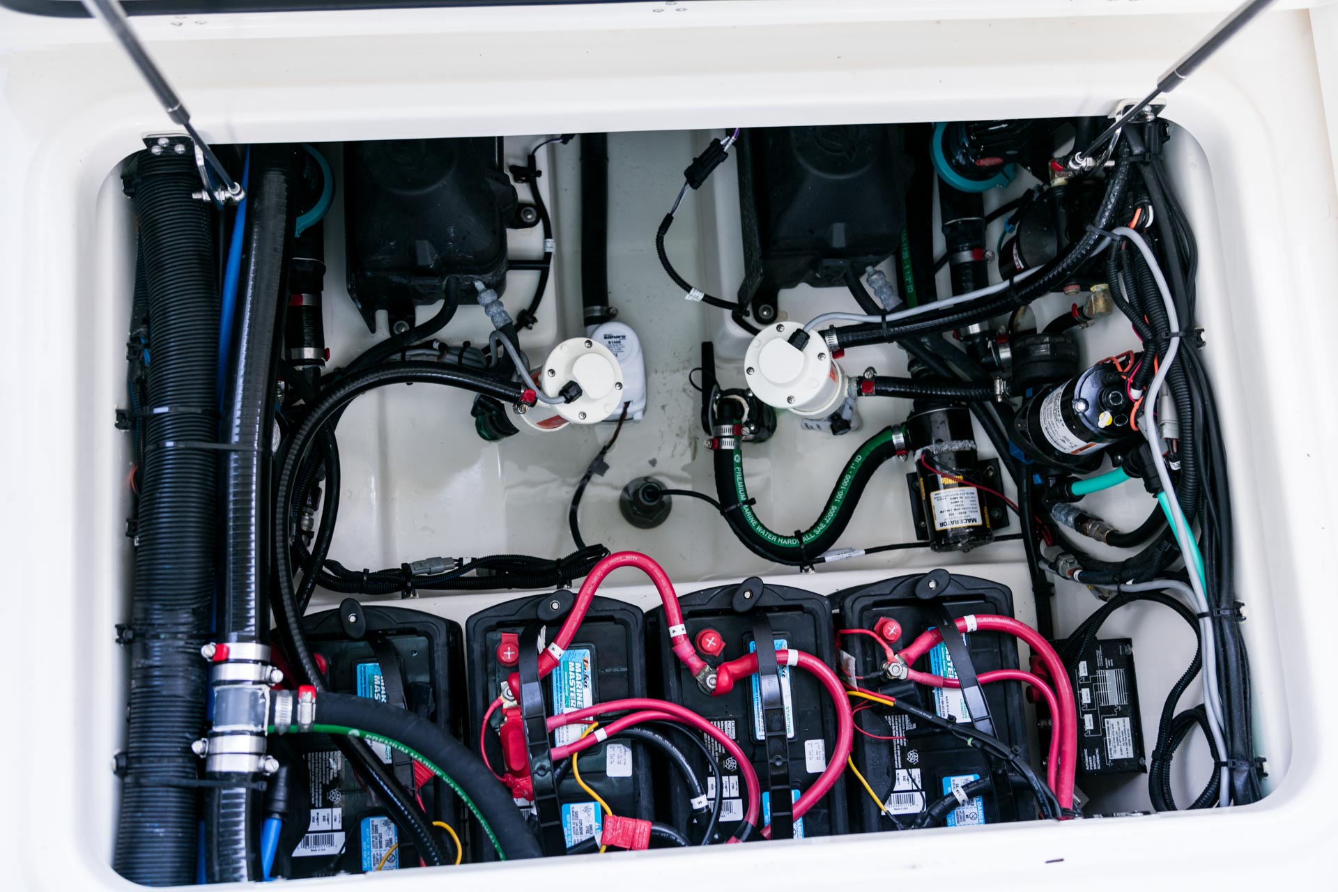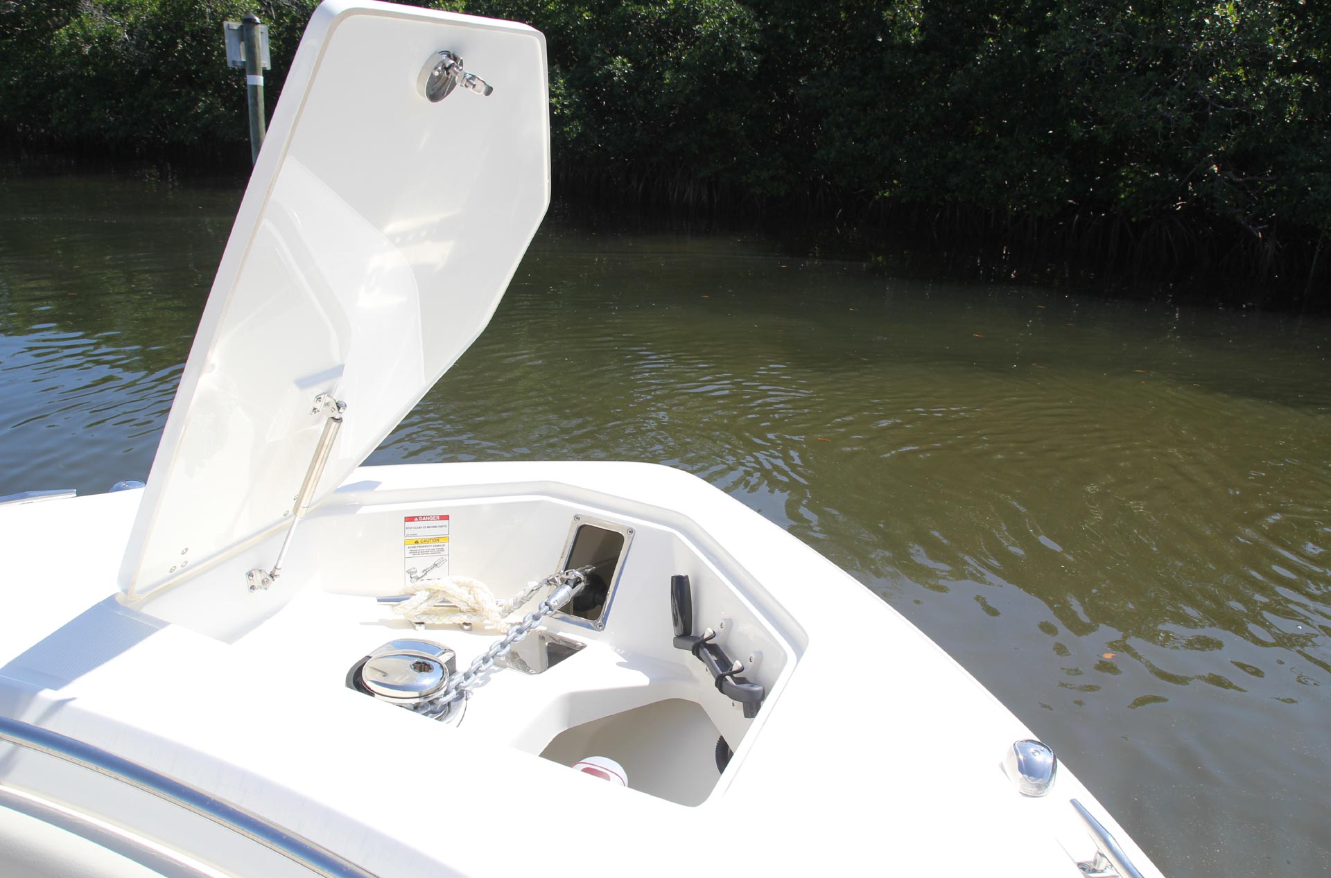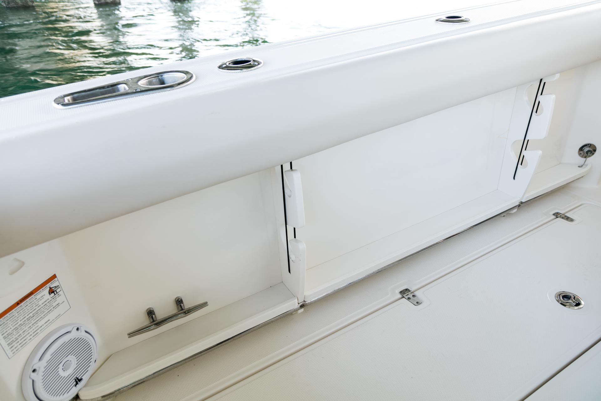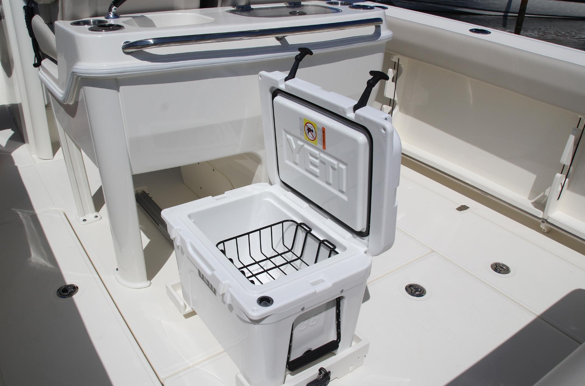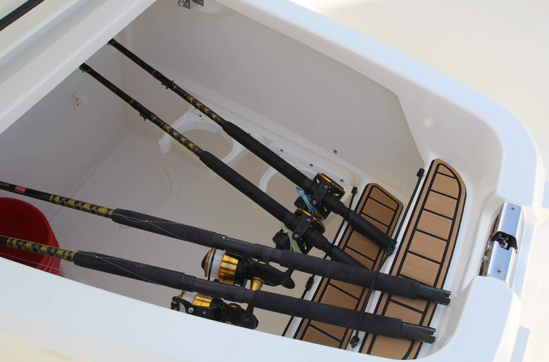 - Deluxe leaning post with bait-prep area, 30-gallon livewell, 3 large fishboxes and more.