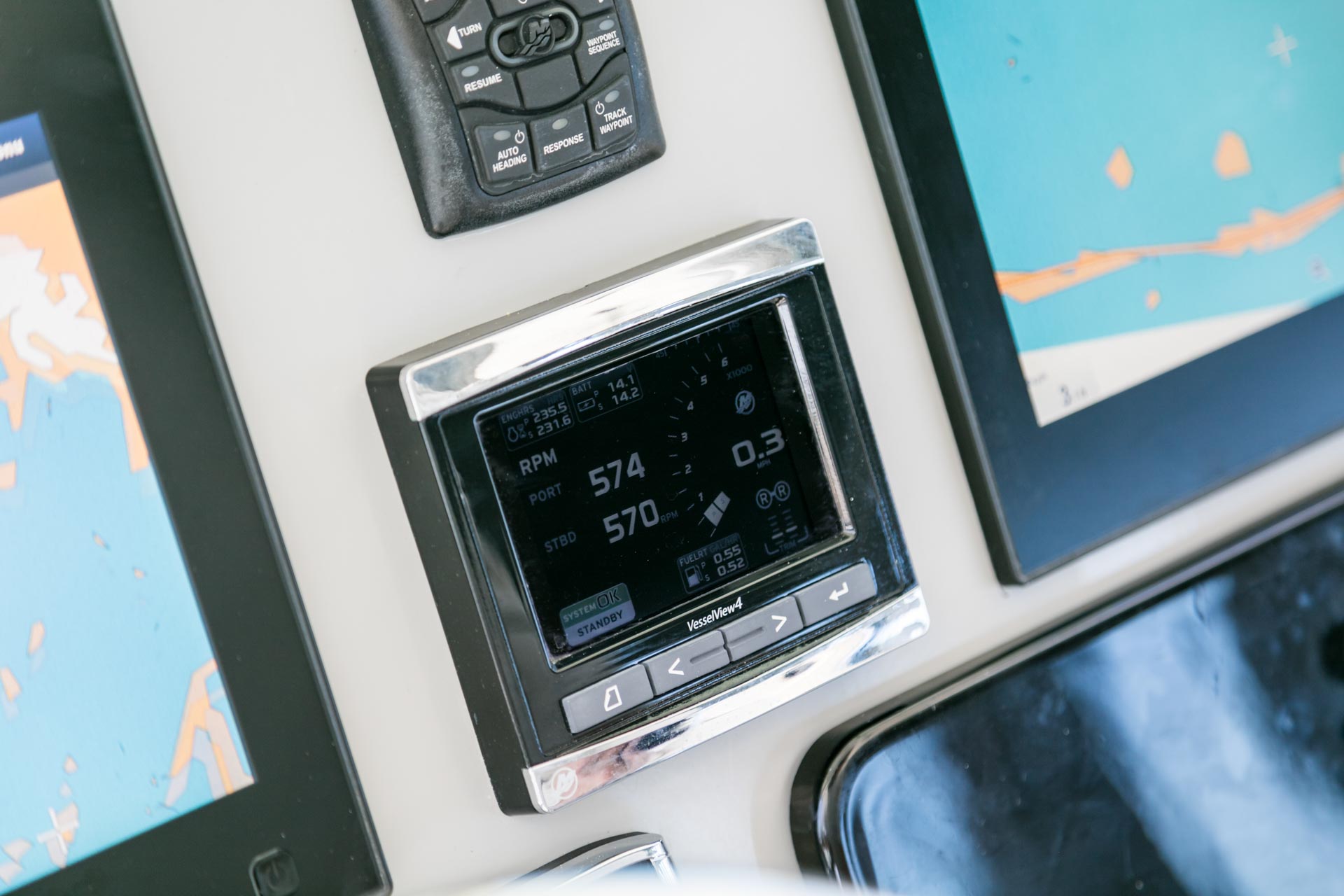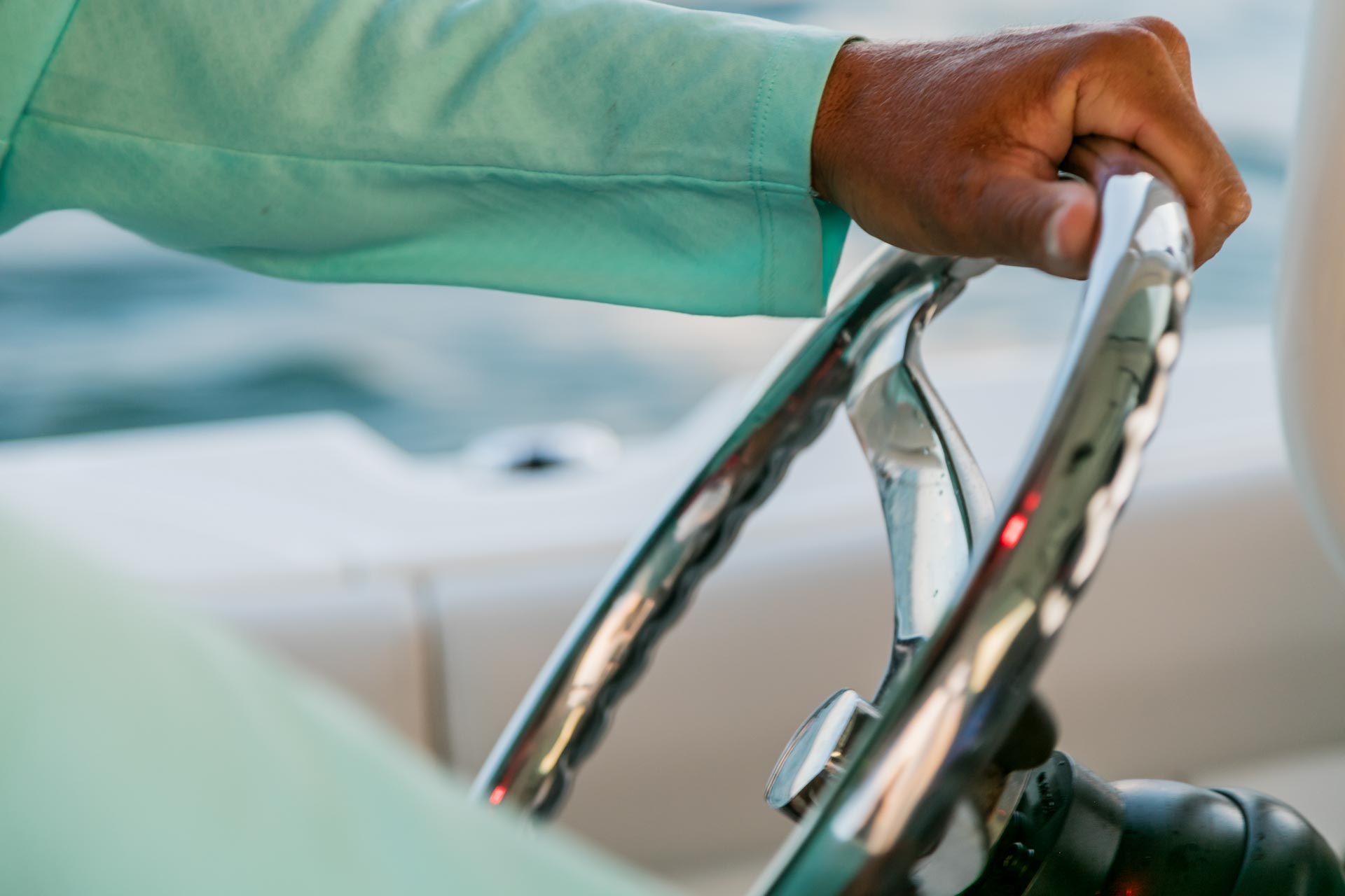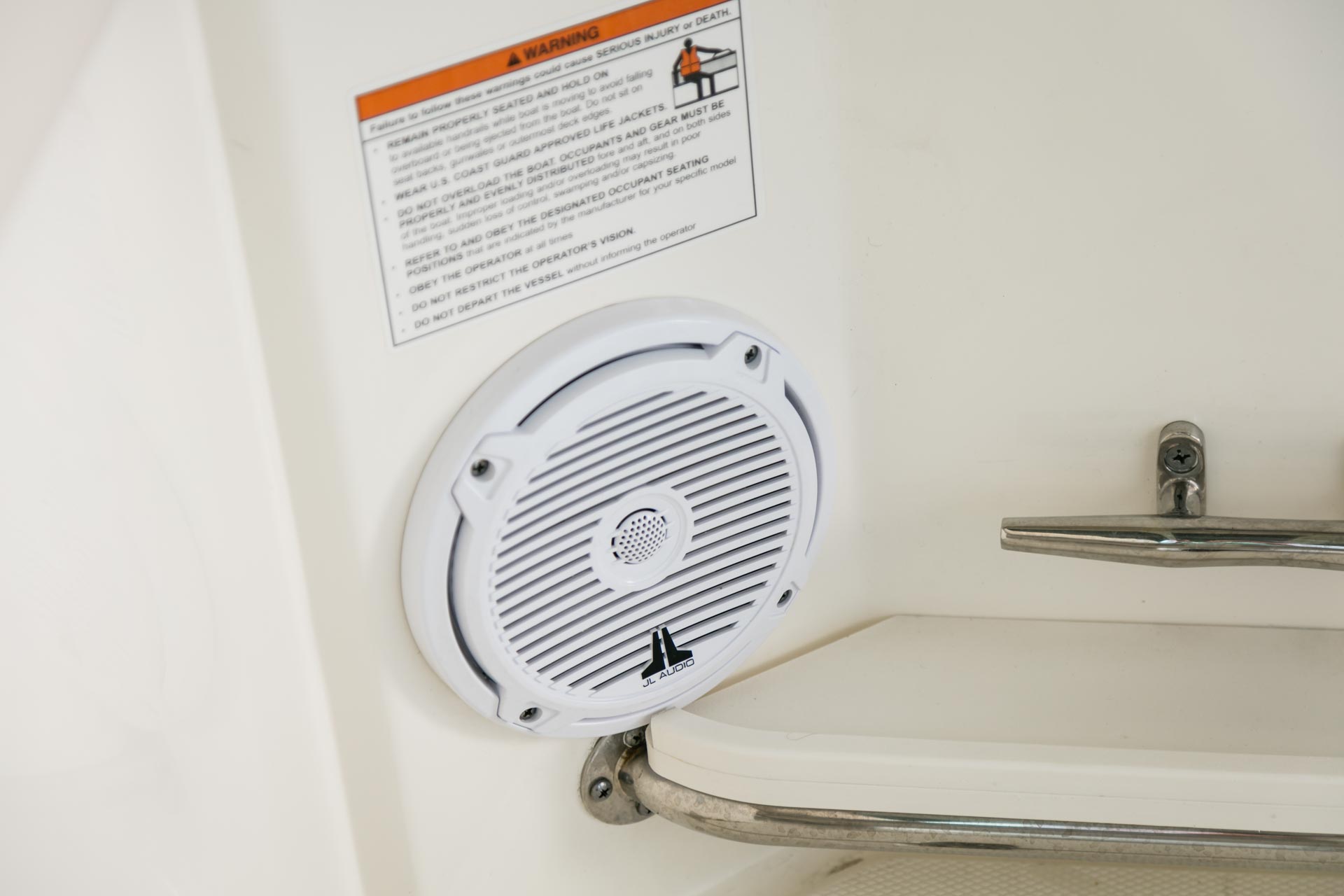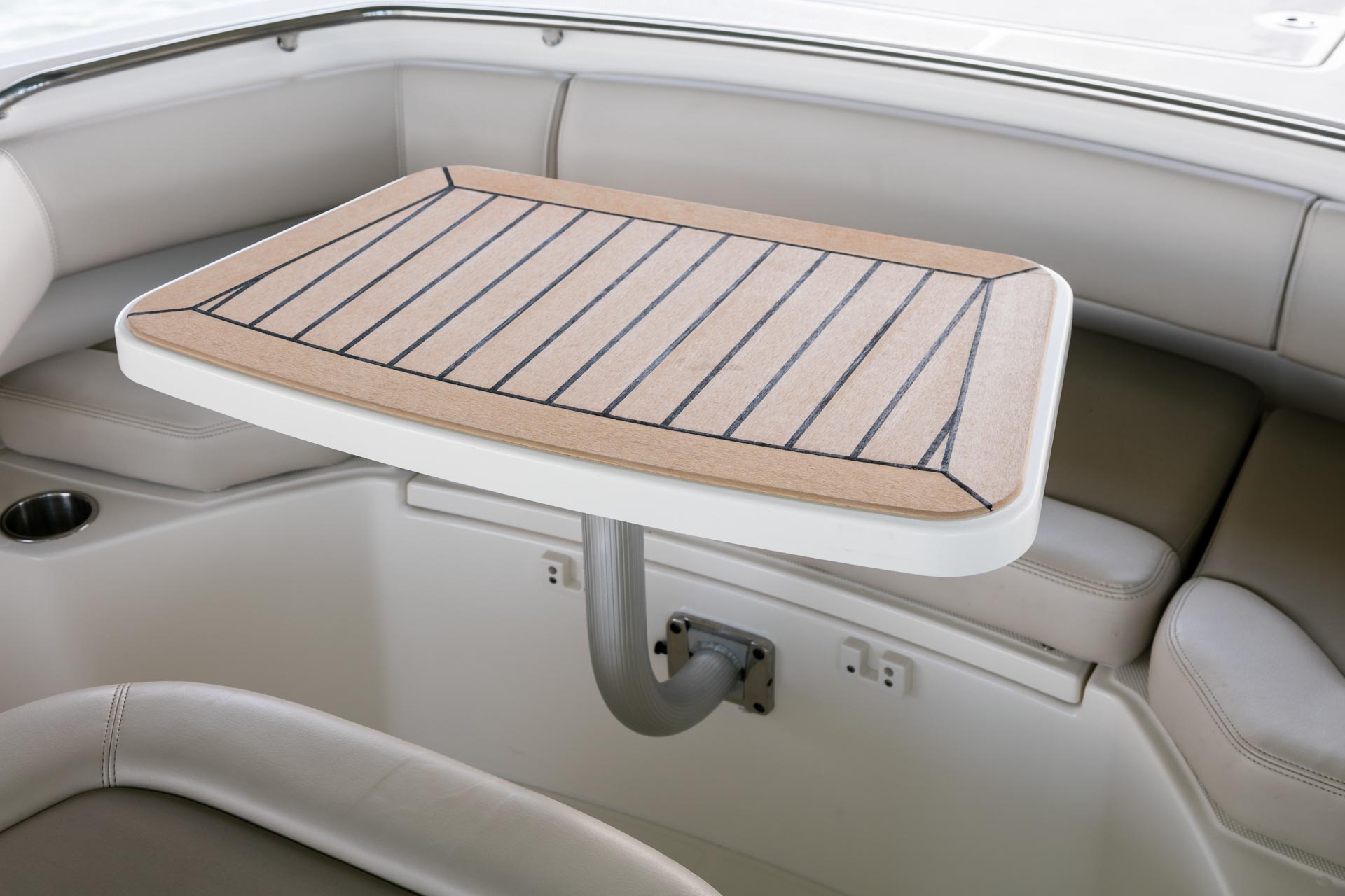 - Optional deluxe helm seating includes an adjustable captain’s chair and stationary companion seat.